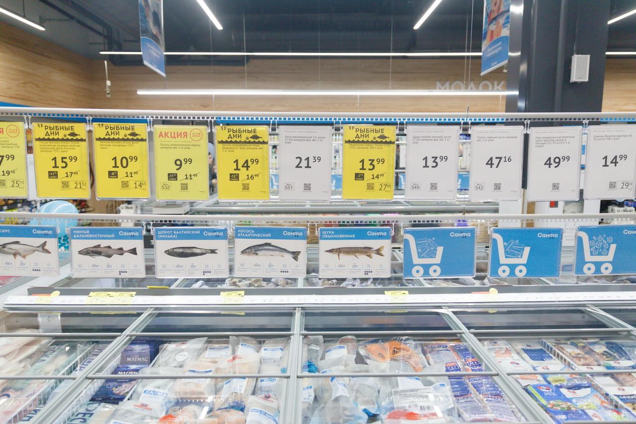 Цены такие: кило авокадо – 7,99, а красного винограда – 9,99 рубля. Вареная колбаса «Советская» стоит 7,79 рубля за кило, сосиски «Баварские» – 6,99 руб., сервелат «Австрийский» – 12,79 руб. Банка горошка или кукурузы выйдет в 2,99 рубля, икры трески – в 4,99 руб, а упаковка слабосоленой форели – в 11,99 рубля. Пачка вареников доступна за 2,59 рубля, а блинчиков с курицей – за 3,79. Полтора литра минералки «Дарида» оценили в 1,19 рубля, столько же Pepsi – в 2,59. Из сладкого: вафли «Черноморские» – 0,79 рубля, большая пачка зефира – 2,59, упаковка заварных пряников – 1,79 рубля.