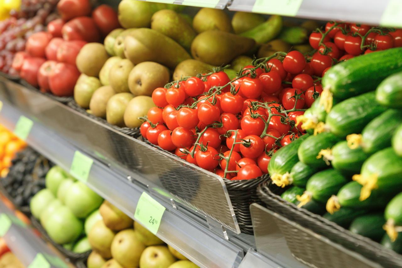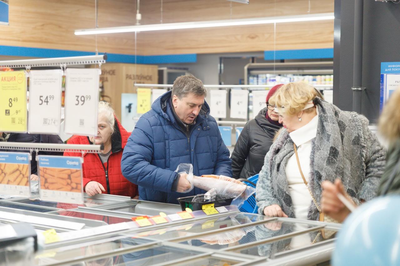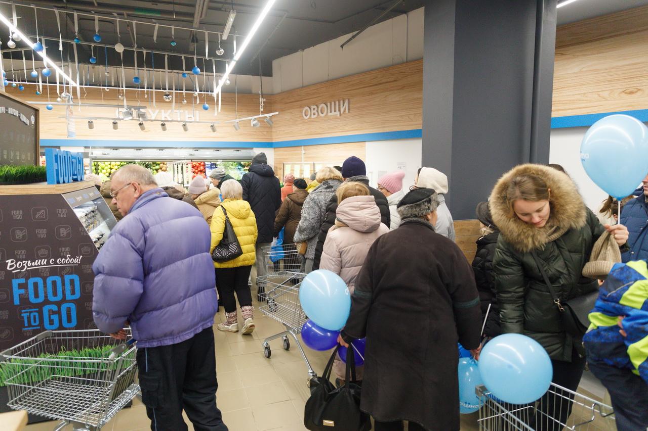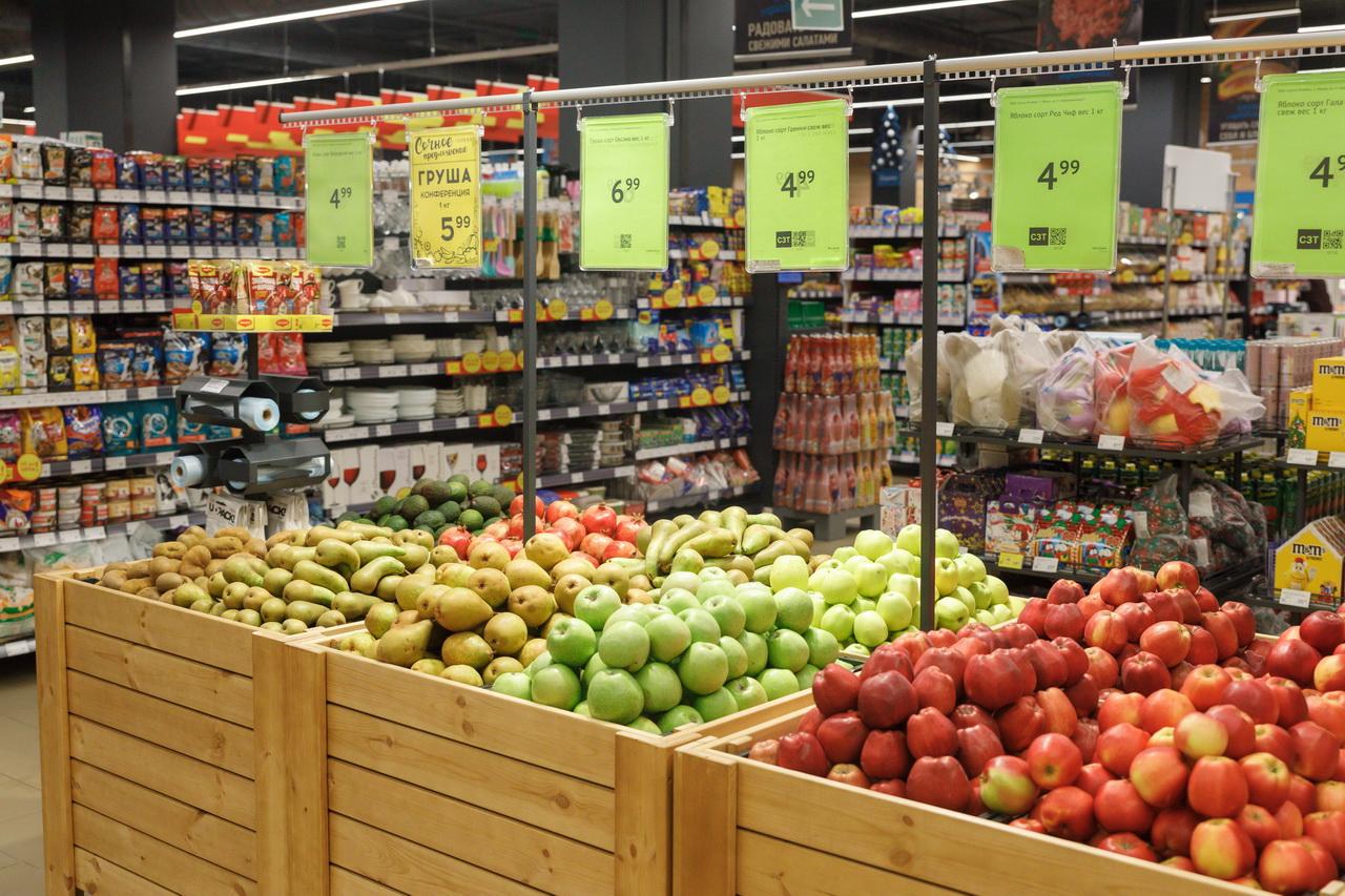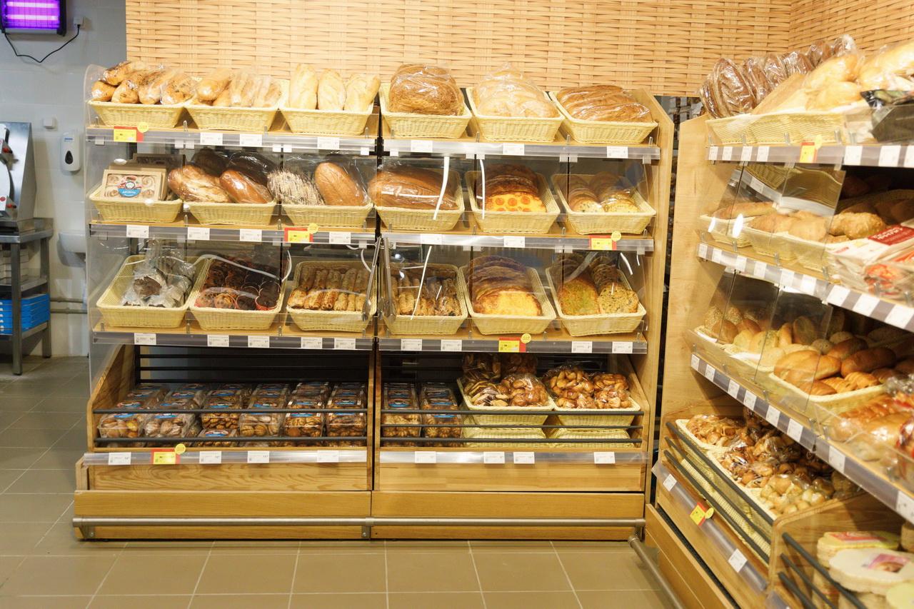 Внутри магазина оборудованы витрины и организованы широкие проходы для семей с детскими колясками. Сориентироваться помогает простая навигация с названиями отделов. Продуктов много: тут и большая молочная витрина, и крупный мясной отдел, и отдельная зона для рыбных изделий. Много места выделено под свежие фрукты, овощи и зелень. Выпечка горячей поступает на прилавок из собственной пекарни.