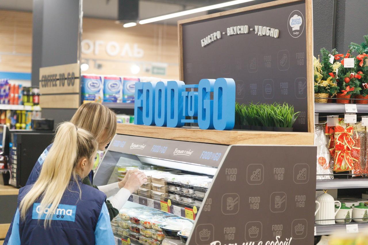 Представлена витрина Food-to-Go с блюдами собственной кулинарии, салатами, сэндвичами или роллами. Предусмотрен и кофе-поинт.