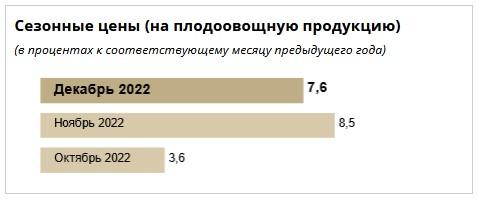 Сезонные цены на плодоовощную продукцию тоже снизились – с 8,5% в ноябре до 7,6% в декабре (в сентябре 2022 года было 3,6%).