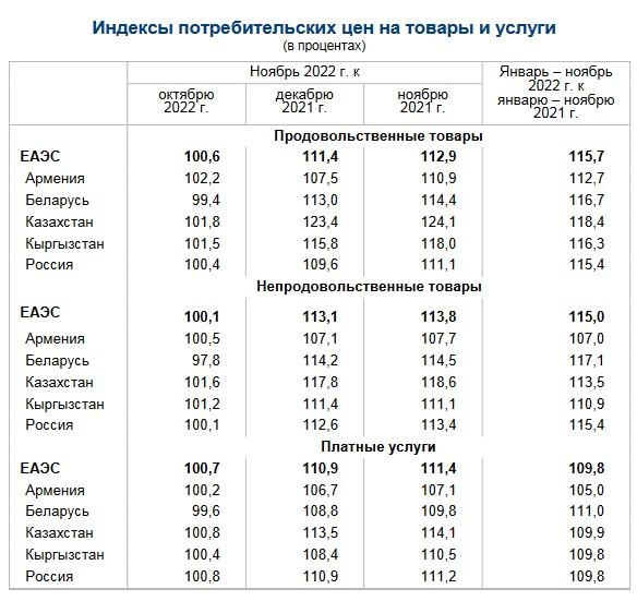 В ЕЭК отметили, что в ноябре 2022 года по сравнению с декабрем 2021 года выше, чем по Евразийскому экономическому союзу, прирост цен на продовольственные товары зафиксирован в Казахстане (на 23,4%), Кыргызстане (на 15,8%) и в Беларуси (на 13,0%). Наибольшее увеличение цен на непродовольственные товары отмечалось в Казахстане (на 17,8%) и в Беларуси (на 14,2%), на платные услуги – в Казахстане (на 13,5%).