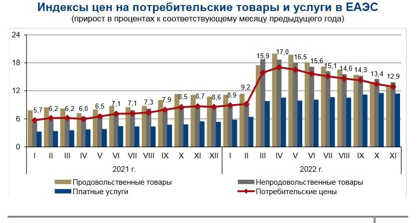 В ноябре 2022 года по сравнению с декабрем 2021 года по ЕАЭС отмечался значительный прирост цен на непродовольственные товары (на 13,1%). Цены на продовольственные товары за этот период увеличились на 11,4%, на платные услуги – на 10,9%, сказано в обзоре.