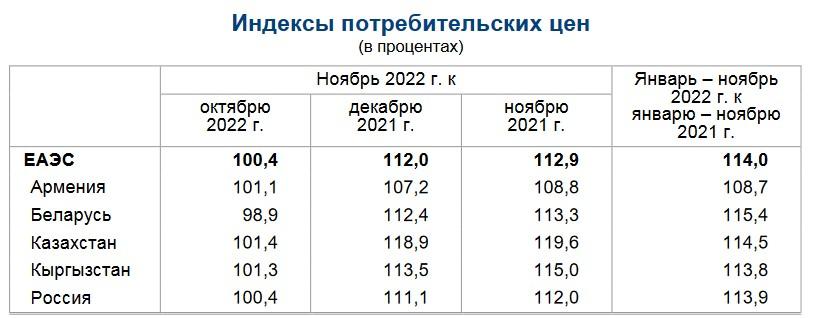 Индекс потребительских цен на товары и услуги по ЕАЭС в ноябре 2022 года по сравнению с октябрем 2022 года составил 100,4%, с декабрем 2021 года – 112,0%.