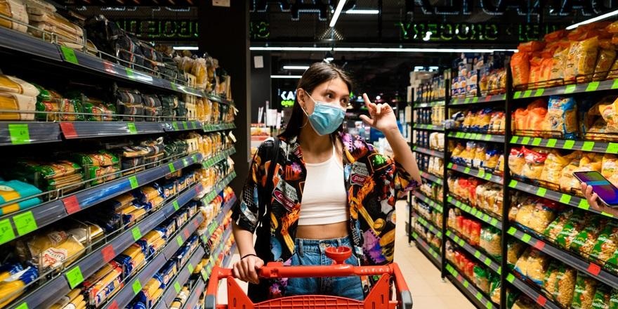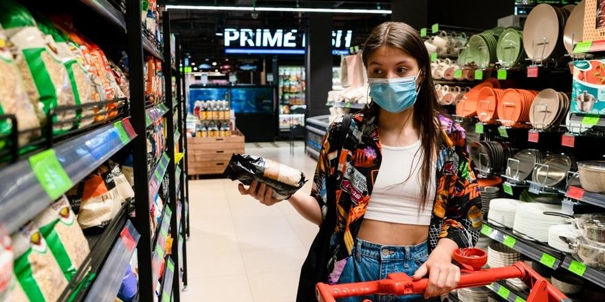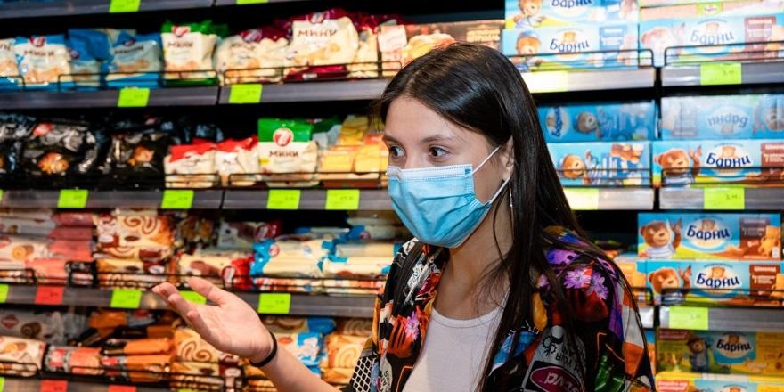 Продвигаемся в отдел с хлебом. Мария ищет на полках цельнозерновой.