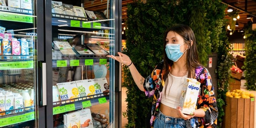 Наши покупки начинаем с полки продуктов для веганов. Мария бегло оглядывает ассортимент, достает из холодильника упаковку с овсяным молоком.
