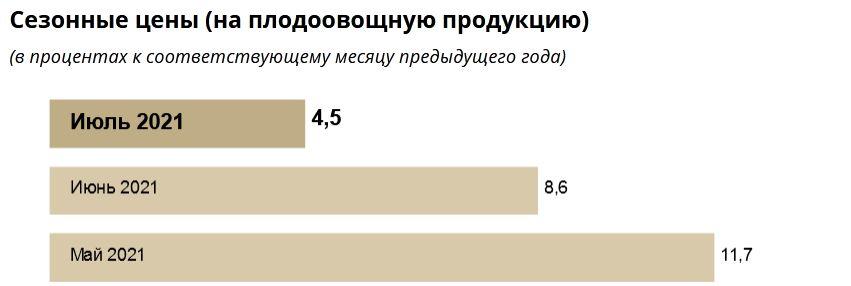В июле значительно снизился рост сезонных цен (на плодоовощную продукцию) и составил 4,5% к июлю 2020 года.