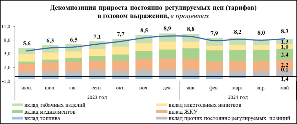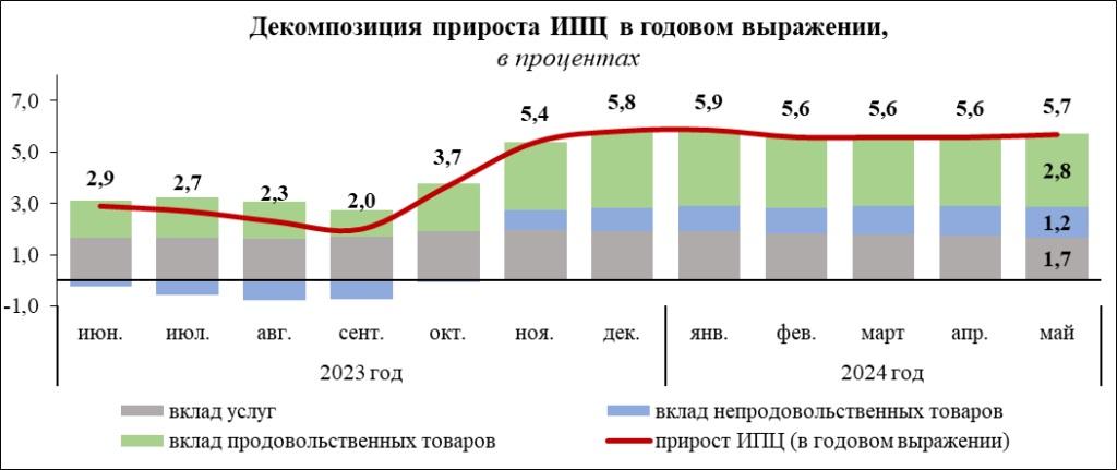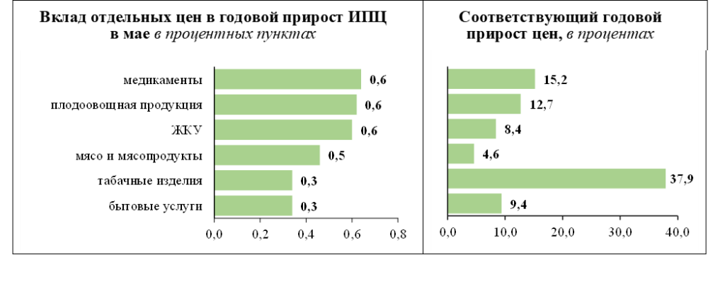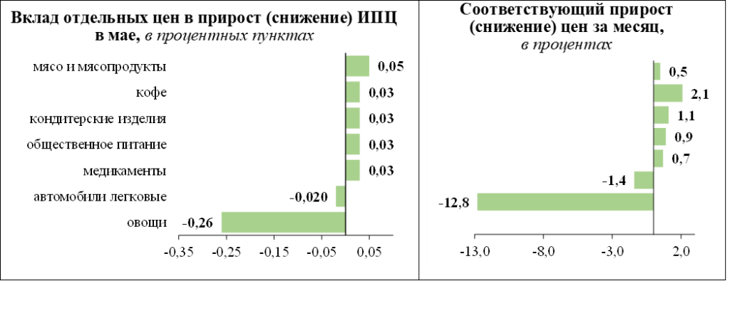«Тарифы на услуги обеспечили вклад в годовую инфляцию порядка 1,7%, что на 0,1 процентного пункта меньше апрельского показателя, вклад цен на непродовольственные товары сохранился на уровне апреля текущего года: 1,2%», – говорится в сообщении ведомства.