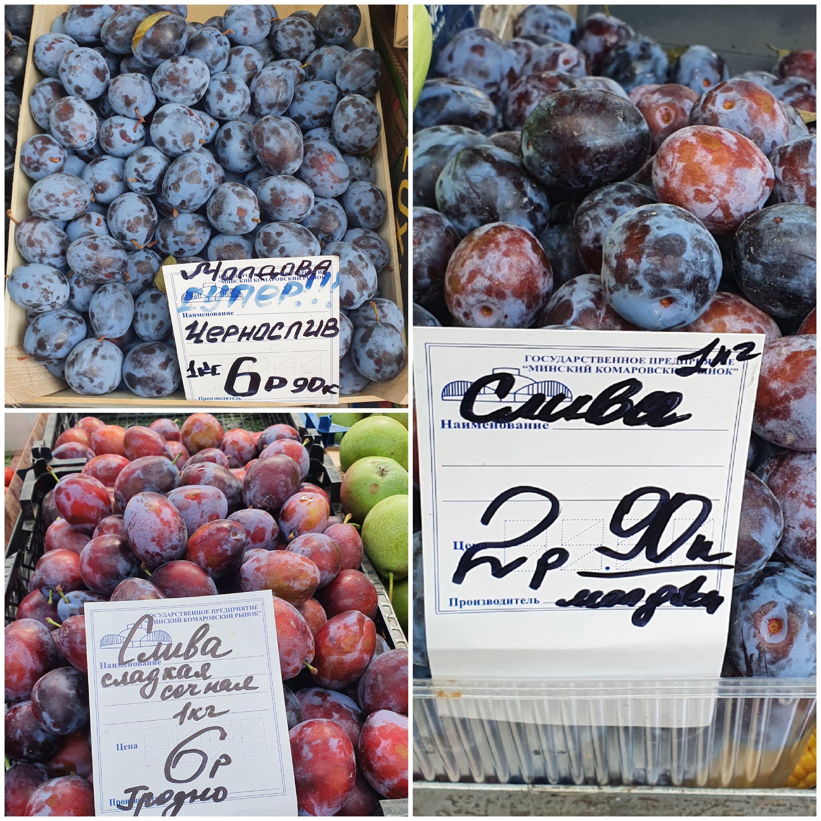 Наступил сезон слив. Их становится на прилавках все больше. Купить сливы можно за 3 руб. за 1 кг. Фрукт из Молдовы. Очень крупную красивую нашли за 6 руб. за кг (указано, что из Гродно).