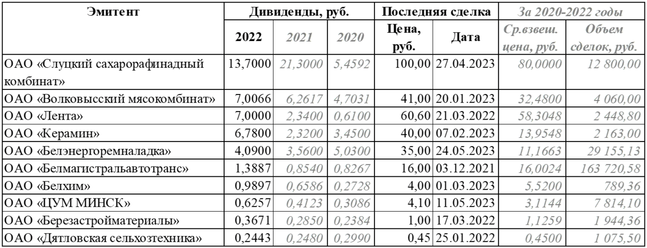 Как видно из таблицы, объем сделок за 3 предыдущих года с акциями данных компаний в основном был незначительным и приобрести их достаточно сложно. Тем не менее некоторые из них, например ОАО «Белэнергоремналадка», в текущем году торгуются регулярно, и информация о возможной доходности ваших инвестиций может быть полезной.