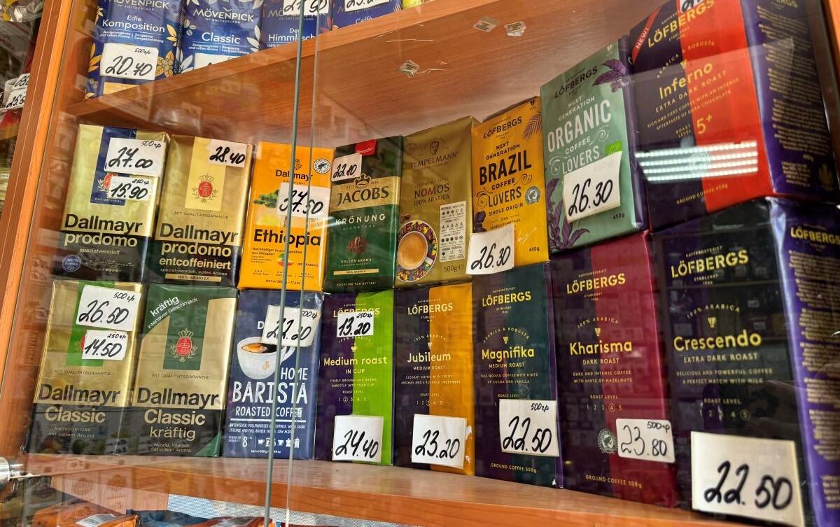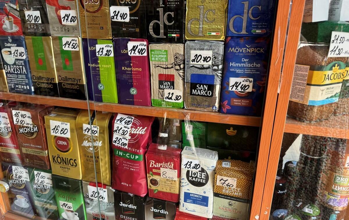 Торговые ряды с кофе и чаем находятся неподалеку от овощных и фруктовых прилавков сезонного рынка. Всего порядка десяти небольших павильонов с вывесками, на которых красуется изображение зерен с обещанием низких цен. Как рассказали продавцы, в топе у покупателей молотый кофе для чашки. Охотнее всего берут вариант по 250 г: Dallmayr (14,50 руб.), золотой Lavazza (15,60 руб.) и Merrild. Последний можно приобрести в трех весовых категориях: 250, 400 и 500 г. Самый большой объем обойдется в 25 рублей. Бюджетный вариант («Жокей традиционный») – за 8 рублей, дешевле стоит только цикорий – в районе 4-5 рублей. Покупателей в будни немного, постоянные клиенты предпочитают закупаться в выходные.