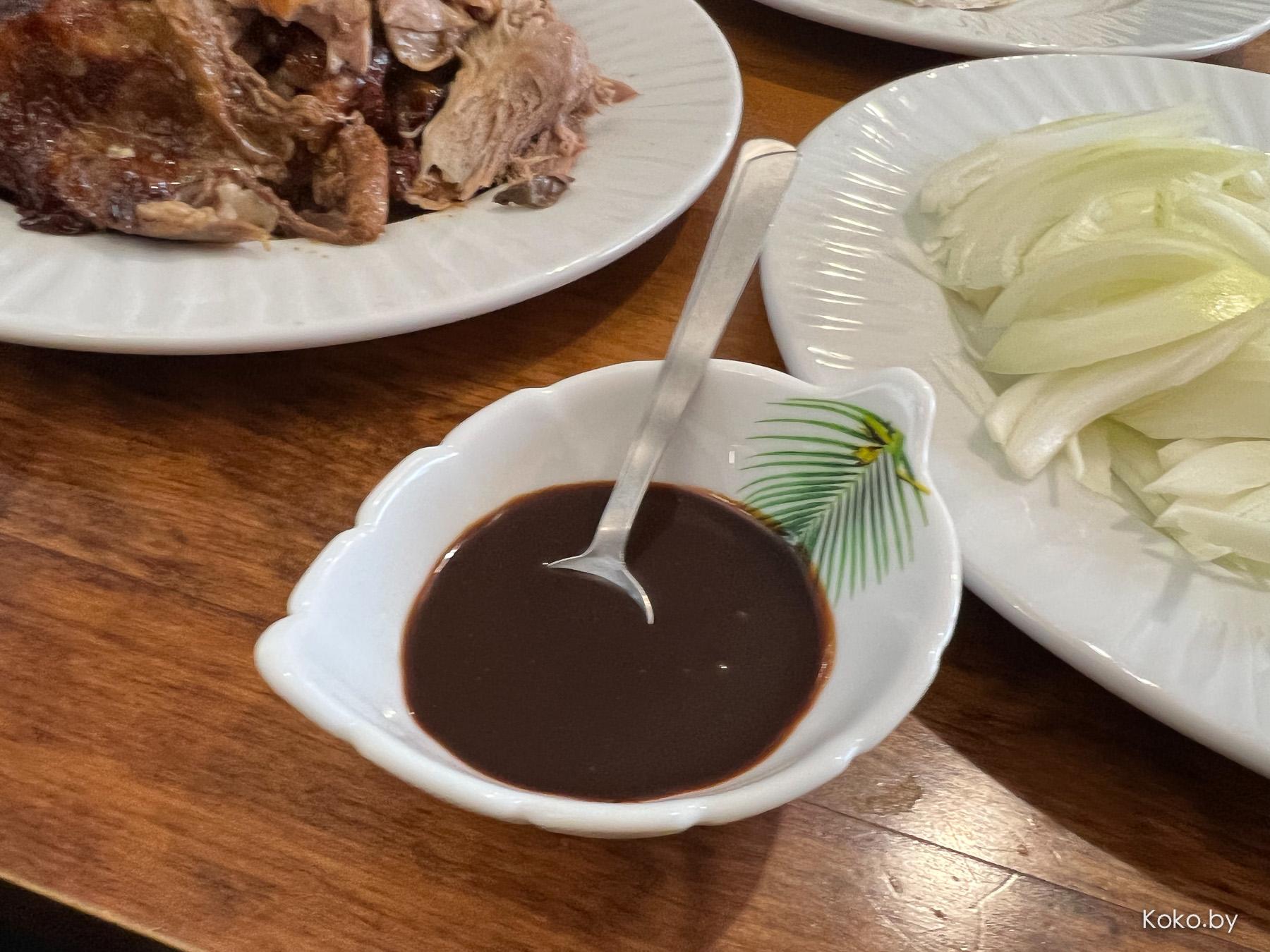 К нежной белорусской утке с тонкой хрустящей кожей подают рисовые блинчики, лук, огурец, бобовый соус и жуткий чесночный майонез из пачки. Если не ошибаюсь, то это Astoria, бррр!