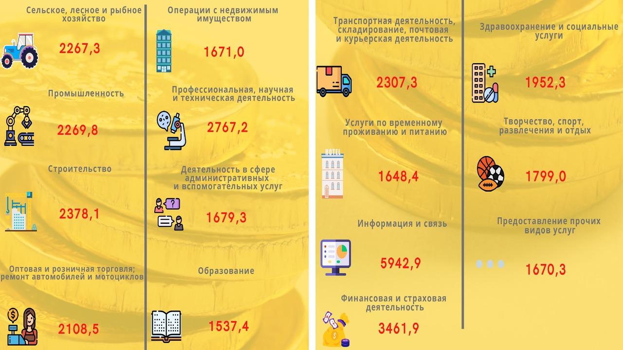 Номинальная начисленная средняя зарплата в финансовой и страховой деятельности составила 3461,9 руб., в профессиональной, научной и технической деятельности – 2767,2 руб.