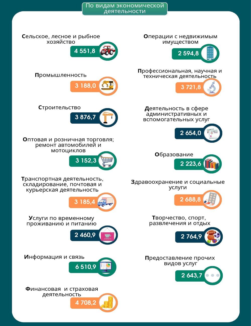 Далее идут финансовая и страховая деятельность (4708,2 руб.), сельское, лесное и рыбное хозяйство (4551,8 руб.), строительство (3876,7 руб.), профессиональная, научная и техническая деятельность (3721,8 руб.).