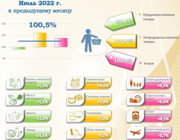 Белстат сообщает, что индекс потребительских цен на товары и услуги в июле по сравнению с июнем 2022 года составил 100,5%, а с декабрем 2021 года – 113,7%.