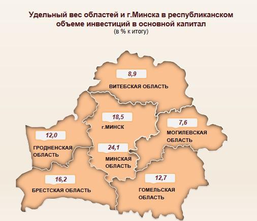 Белстат приводит данные об удельном весе областей Беларуси и Минска в республиканском объеме инвестиций в основной капитал:
