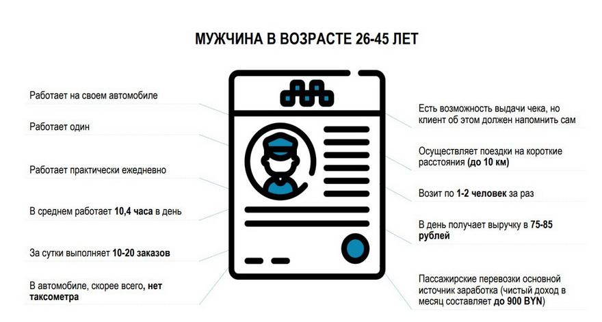 Итоги исследования опубликованы на официальном сайте учреждения: часть 1 и часть 2. По данным БГЭУ, портрет среднестатистического таксиста – это мужчина 26-45 лет, работающий на собственном авто, его ежемесячный доход находится в пределах 900 белорусских рублей. При этом он работает более 10 часов в сутки ежедневно, принимая заказы в основном на короткие расстояния. Также в исследовании отмечается, что доля нелегального извоза по стране достигает 29% от рынка такси в целом. Годовой объем перевозок такси составляет 824,1 млн рублей, из которых на теневой рынок приходится 239 млн.