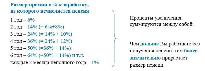 Если отказываешься от пенсии на год, то начисляется 6%, на два года – 8%, на три года – 10%, на четыре года – 12%, на пять лет и более – по 14%. Проценты увеличения суммируются между собой.