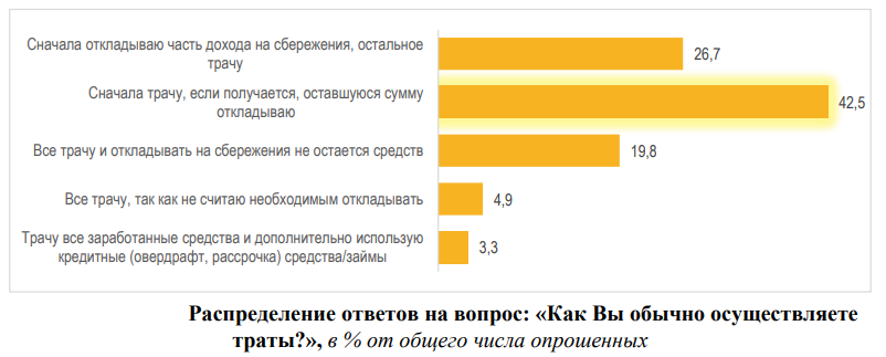 Анализ подходов к распоряжению личным/семейным доходом показал, что при наличии установок на сбережение «эффективной стратегии трат», при которой сначала откладывается часть дохода на сбережения, а оставшаяся часть тратится, придерживается только 26,7% населения.