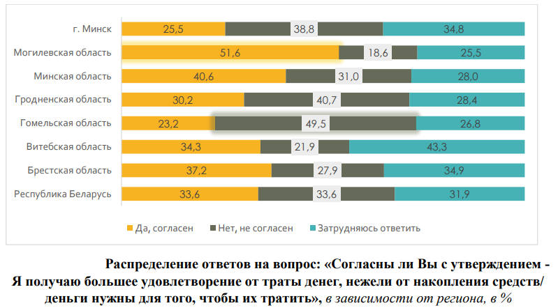 Отдают предпочтение тратам денежных средств чаще других жители Могилевской области – более половины из них (51,6%) получают большее удовлетворение от расходования средств, нежели от их накопления.
