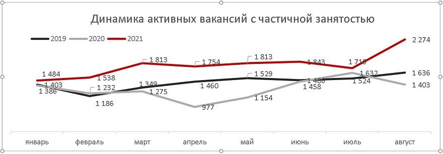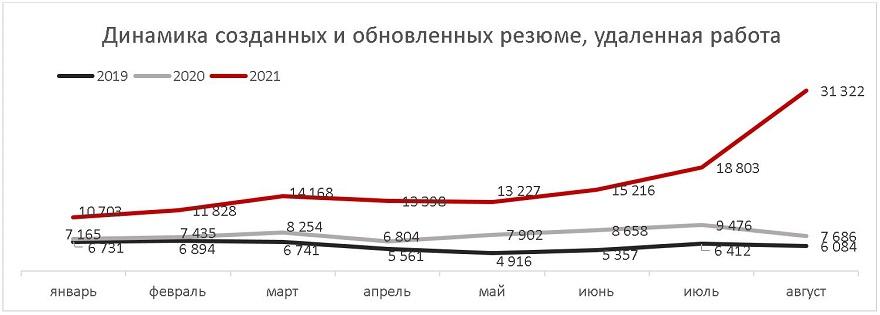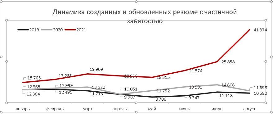 Интерес к работе с частичной занятостью демонстрирует и динамика созданных и обновленных резюме. В январе-августе 2021 года количество резюме к аналогичному периоду прошлого года выросло на 77,9%