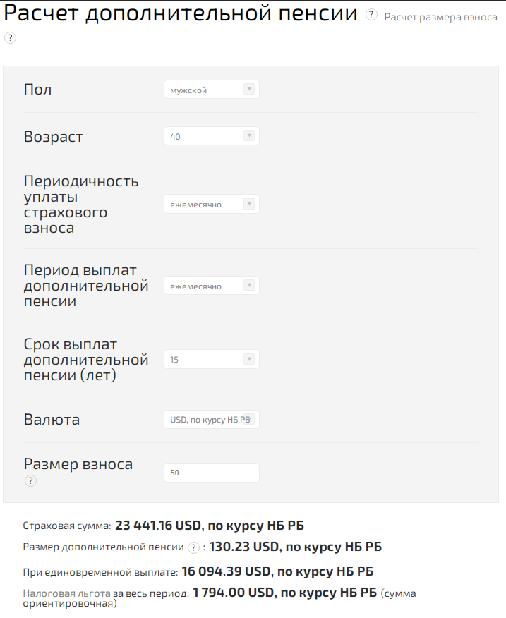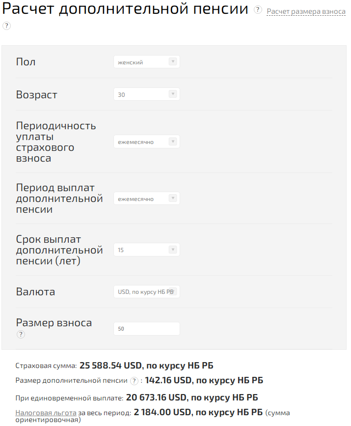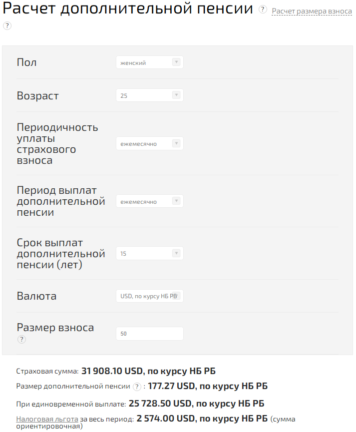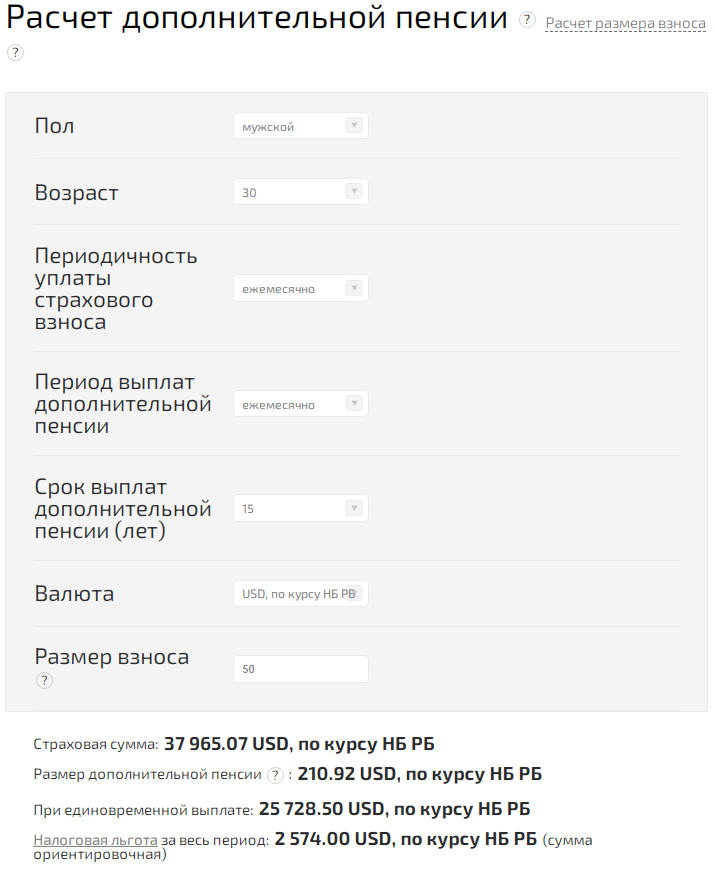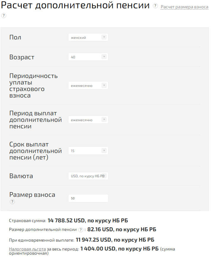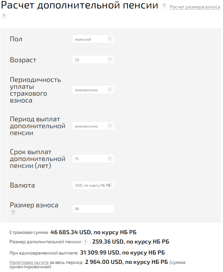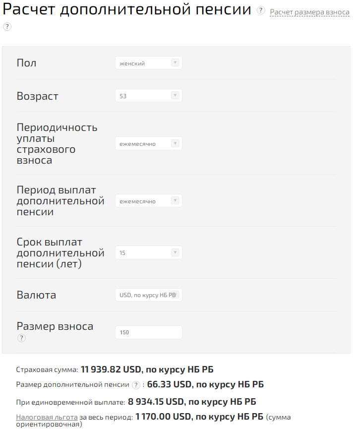 Предположим, он выберет дополнительную пенсию в течение 15 лет. Тогда он будет получать каждый месяц $259,36 в рублях по действующему курсу Нацбанка. В сумме за 15 лет это составит $46 685,34.