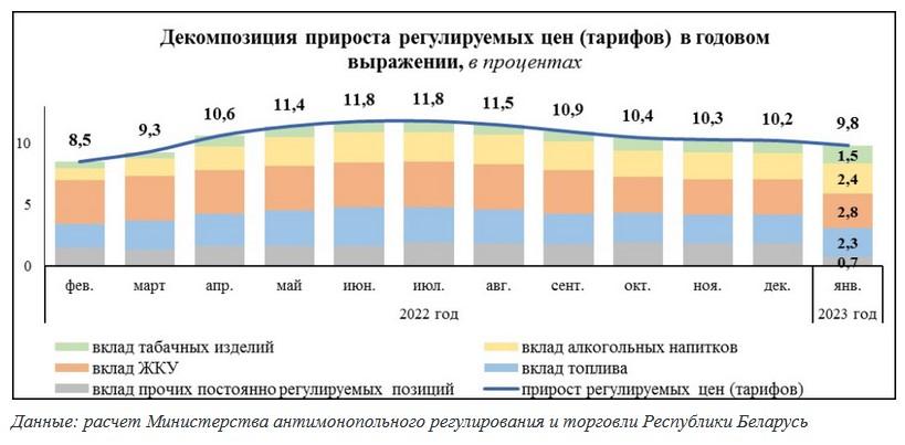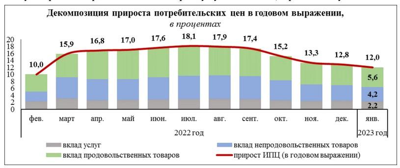 «За январь 2023 г. к декабрю 2022 г. годовой прирост ИПЦ замедлился на 0,8 процентного пункта, чему во многом продолжают способствовать действующие ограничения роста цен. Половина всего его замедления обусловлена сокращением влияния удорожания продовольственных товаров с 6 процентных пунктов в декабре 2022 г. до 5,6 процентного пункта в отчетном месяце. Вклад в годовую инфляцию непродовольственных товаров и услуг снизился по 0,2 процентного пункта», – сказано в комментарии Министерства антимонопольного регулирования и торговли.
