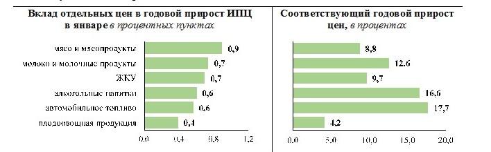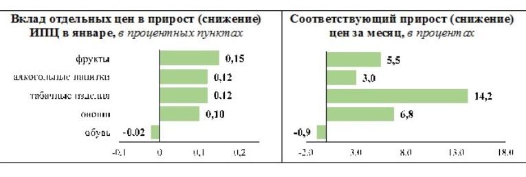 За январь к декабрю предыдущего года около 60% всей инфляции обусловлено двумя факторами: удорожанием преимущественно импортных овощей и фруктов, а также повышением цен на подакцизные товары.