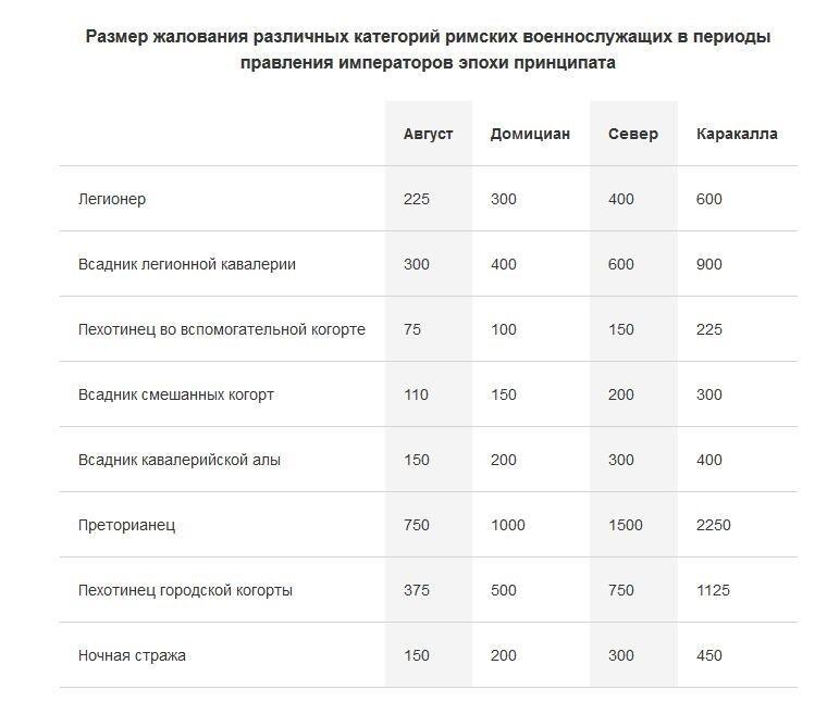 В целом, оно зависело от следующих факторов: наличие римского гражданства, типа войск, в которых проходила служба, звания и места в иерархии легиона, а также местности его дислокации. Центурионы и другие офицеры получали большее жалование в легионе, за ними шли легионеры, которые, в свою очередь, могли получать полуторное или двойное жалование, затем всадники и пехотинцы вспомогательных подразделений – ауксилариев. Больше всего, и это неудивительно, получала личная охрана императора и преторианская гвардия.