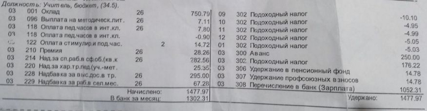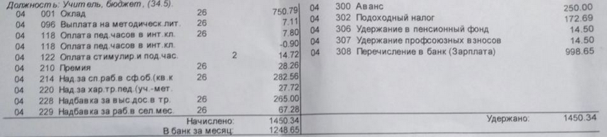 - Оклад ― 750 рублей 79 копеек (недельная ставка учителя 20 часов, у меня ― 34,5)