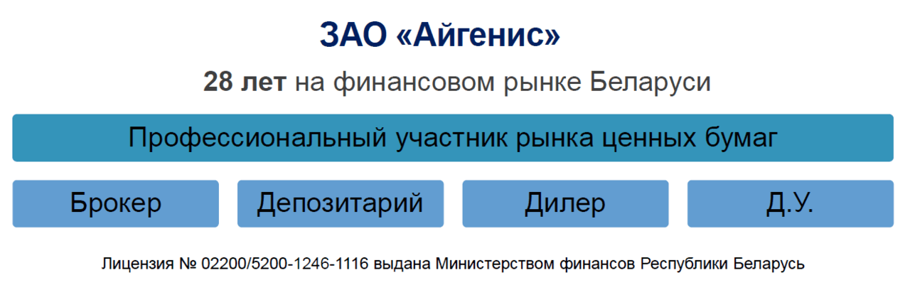 Данный обзор подготовлен ЗАО «Айгенис» - первой брокерской компанией, выпустившей на рынок программный комплекс AIGENIS invest (AppStore | Google Play | WEB) собственной разработки, включающий в себя мобильное приложение и веб терминал, предоставив онлайн-доступ физическим лицам к биржевым торгам ценными бумагами на ОАО «Белорусская валютно-фондовая биржа».