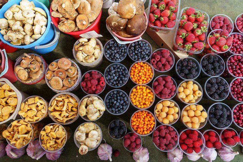 У торговок, продающих с полдюжины разных видов ягод – явно не со своих соток, – «все по 5»: «ежемалина» (или тибетская, земляничная), клубника, черника, облепиха – цена за небольшой стаканчик. И грибы, на которые они отказались назвать цену…