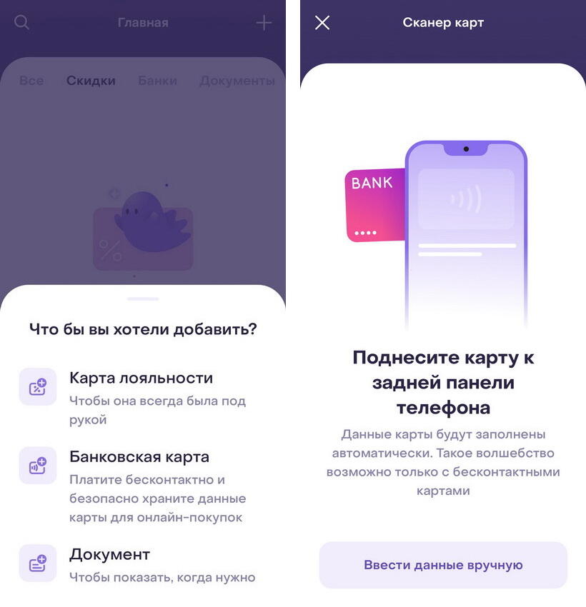 В Swoo можно добавлять не только банковские, но и скидочные карты, что избавляет от необходимости носить их с собой.