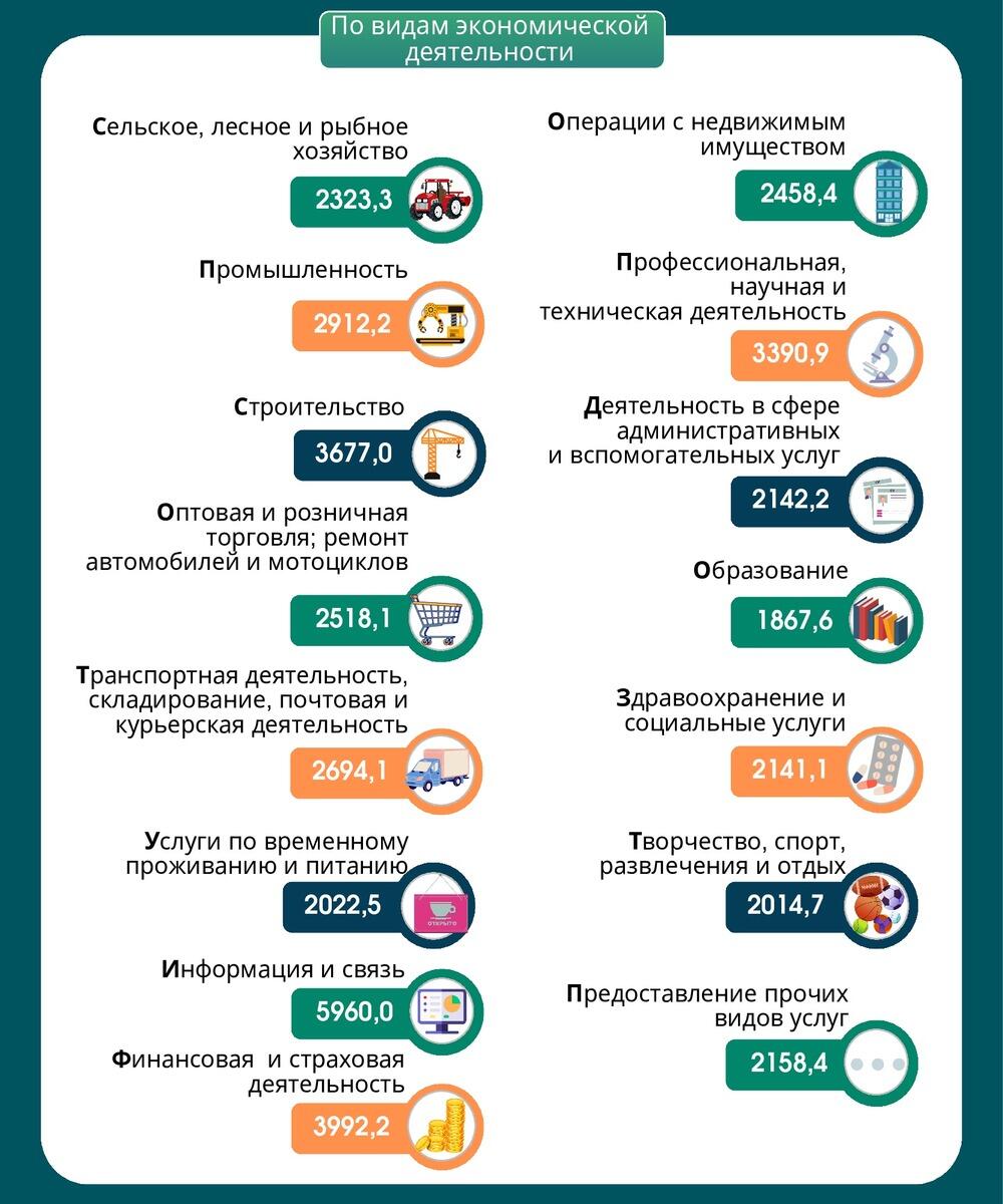 В топ-3 самых высокооплачиваемых видов экономической деятельности входят информация и связь (5960 руб.), финансовая и страховая деятельность (3992,2 руб.), а также строительство (3677 руб.).