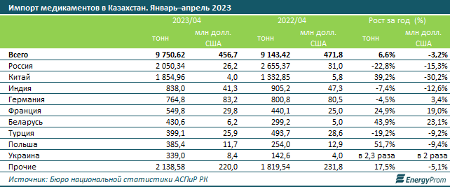 Эксперты отмечают, что в январе – апреле 2023 года в стоимостном выражении главными поставщиками медикаментов в Казахстан выступали Германия и Индия.