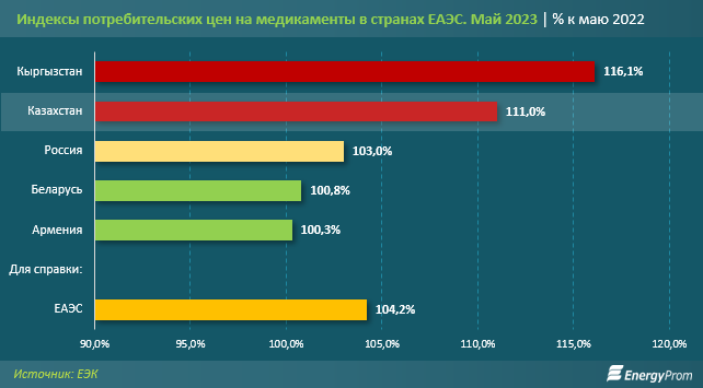 Исследование показало, что годовой рост цен на медикаменты в ЕАЭС в мае 2023 года составил 4,2%. Лидерами по росту цен на лекарства оказались Кыргызстан (+16,1%) и Казахстан (+11,0%).
