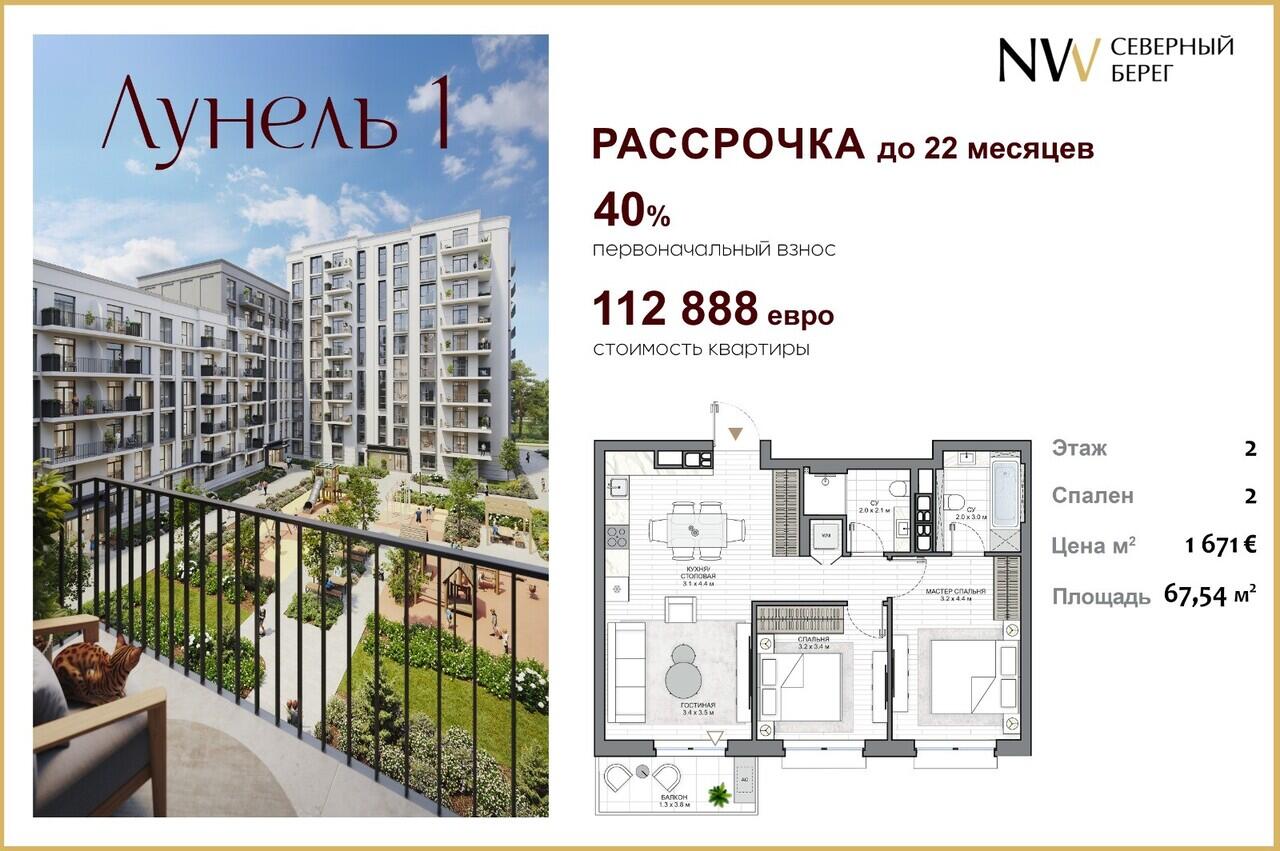 Для расчета рассрочки выбираем эргономичную 2-спальную квартиру c 3-метровыми потолками и французскими балконами. Новая современная школа уже строится прямо напротив дома, а дошколят можно водит в детский сад «Серебряный кит», который уже открыл свои двери. Идеальное решение для семьи с одним или двумя детьми.