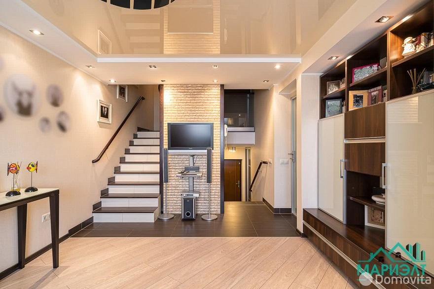Еще одно детище 90-х – кирпичный дом с башней на улице Денисовской. Здесь трехкомнатная квартира одновременно означает и то, что она трехуровневая. На первом уровне находится вход и коридор с гардеробной. На следующем уровне кухня-столовая с современной техникой, которая была установлена только в 2021 году. На третьем – две спальни.