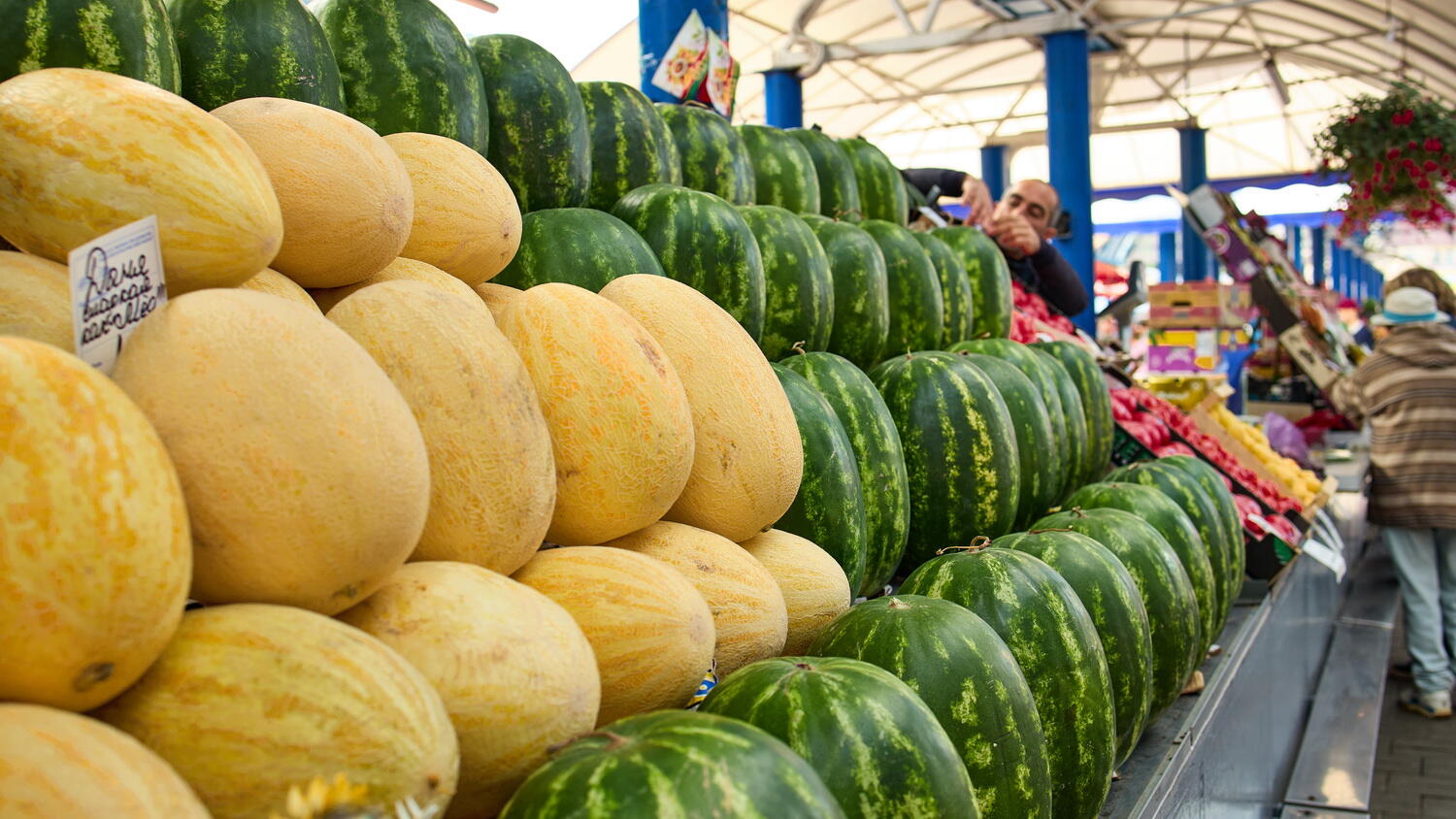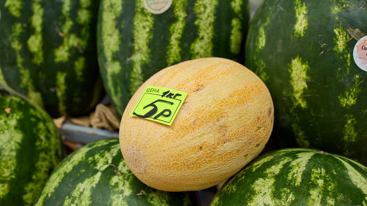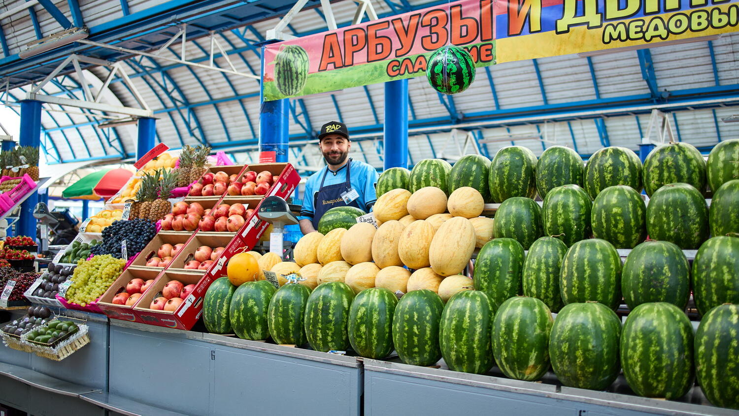 Наше внимание привлекает витрина с «монотоваром» – на прилавках только дыни, арбузы и гранаты. Ими торгует Арсен – спрашиваем про цены и прогнозы и его.