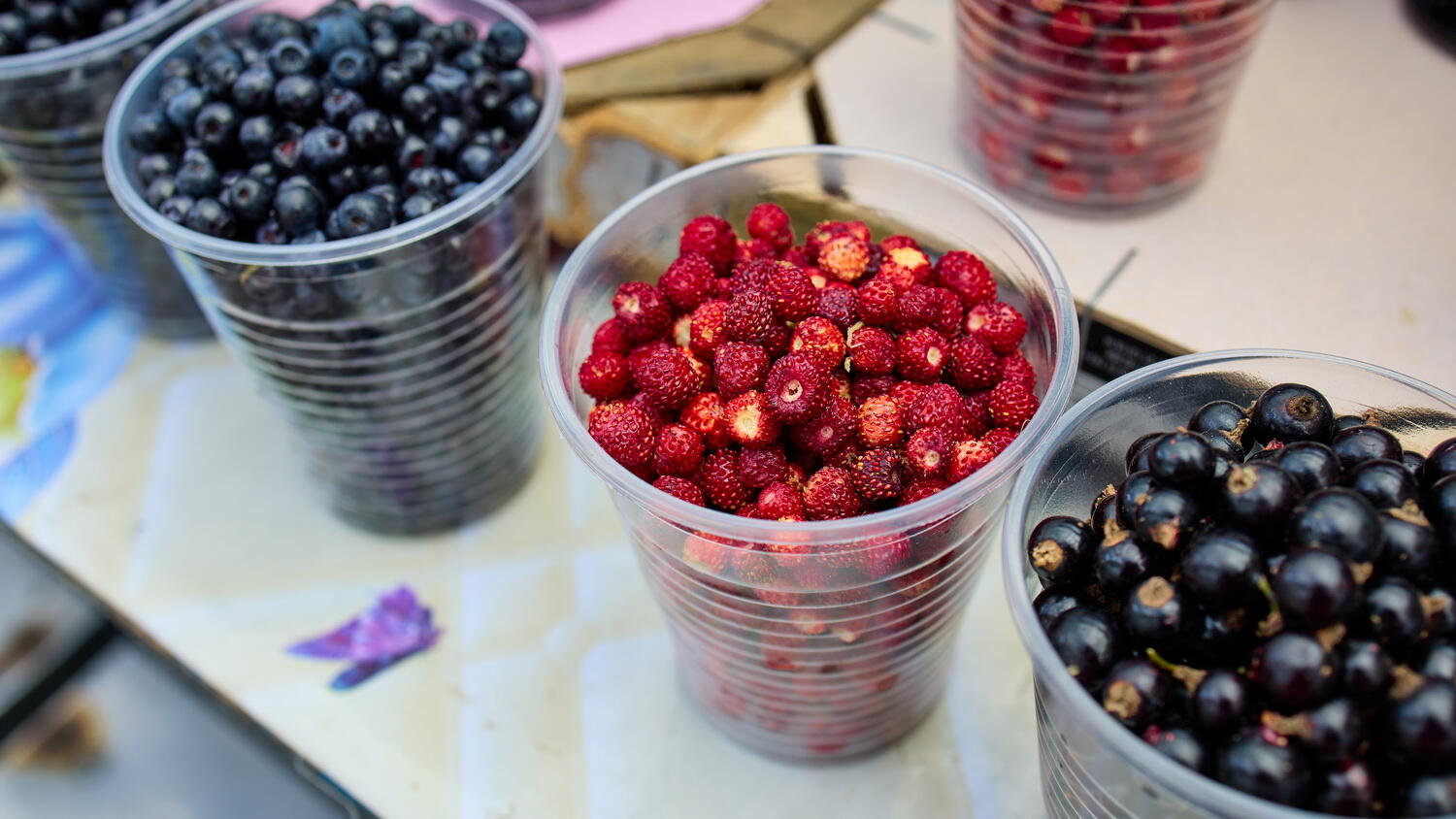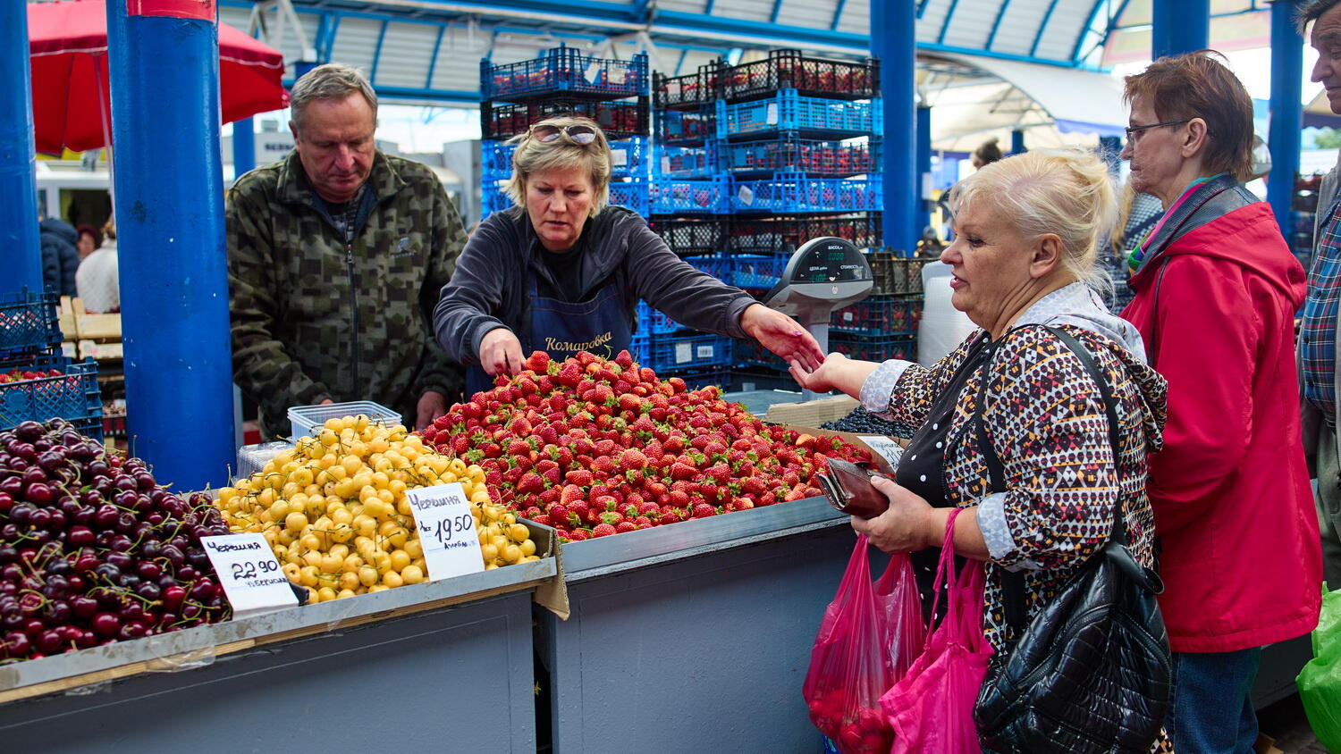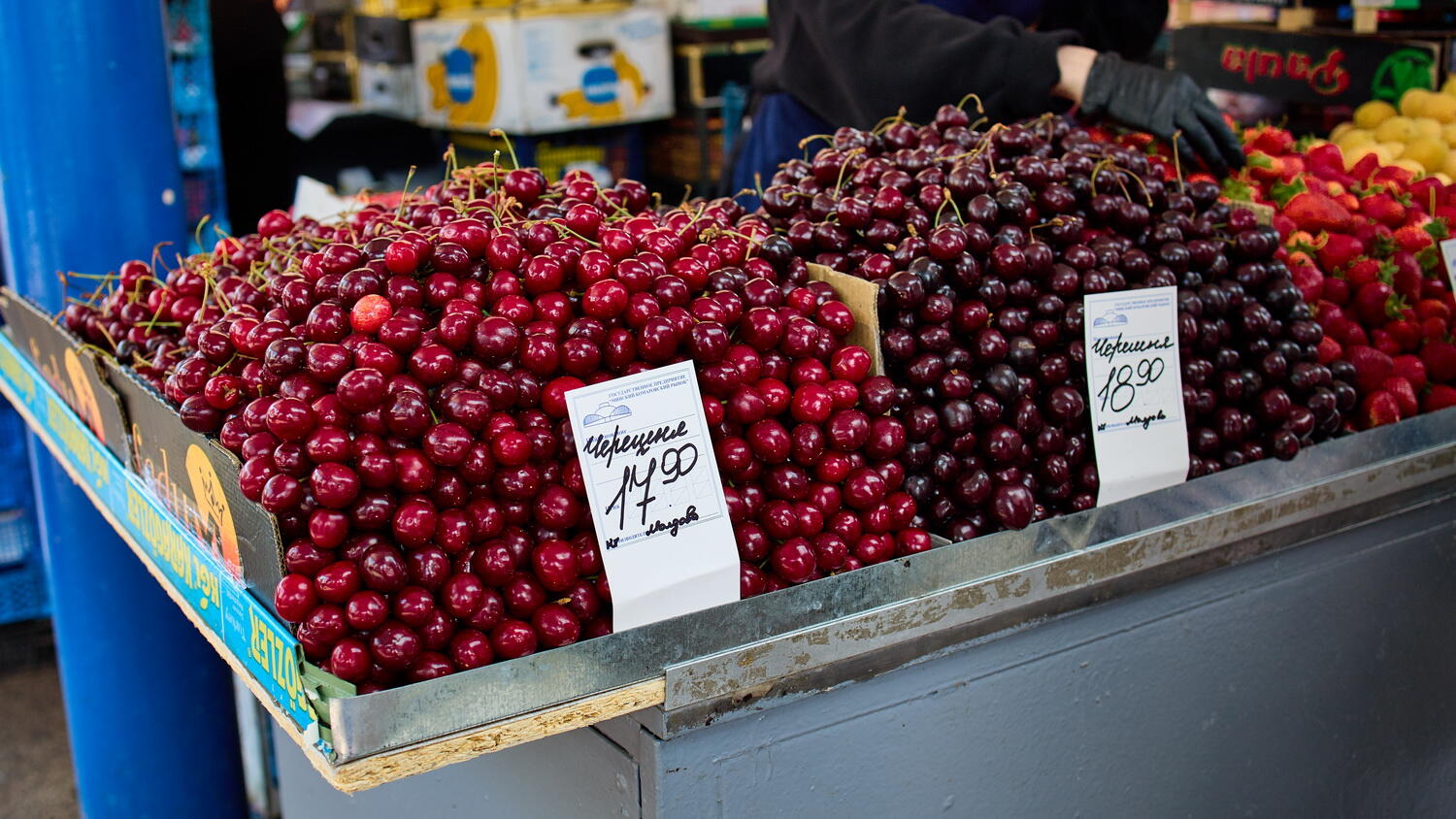 Будний день, полдень – но на рынке полно народа. Самые длинные очереди копятся у лотков с развесной ягодой: активнее всего разбирают клубнику с черешней. Кроме них, на прилавках уже лежит вишня, голубика, черника, смородина и даже земляника.