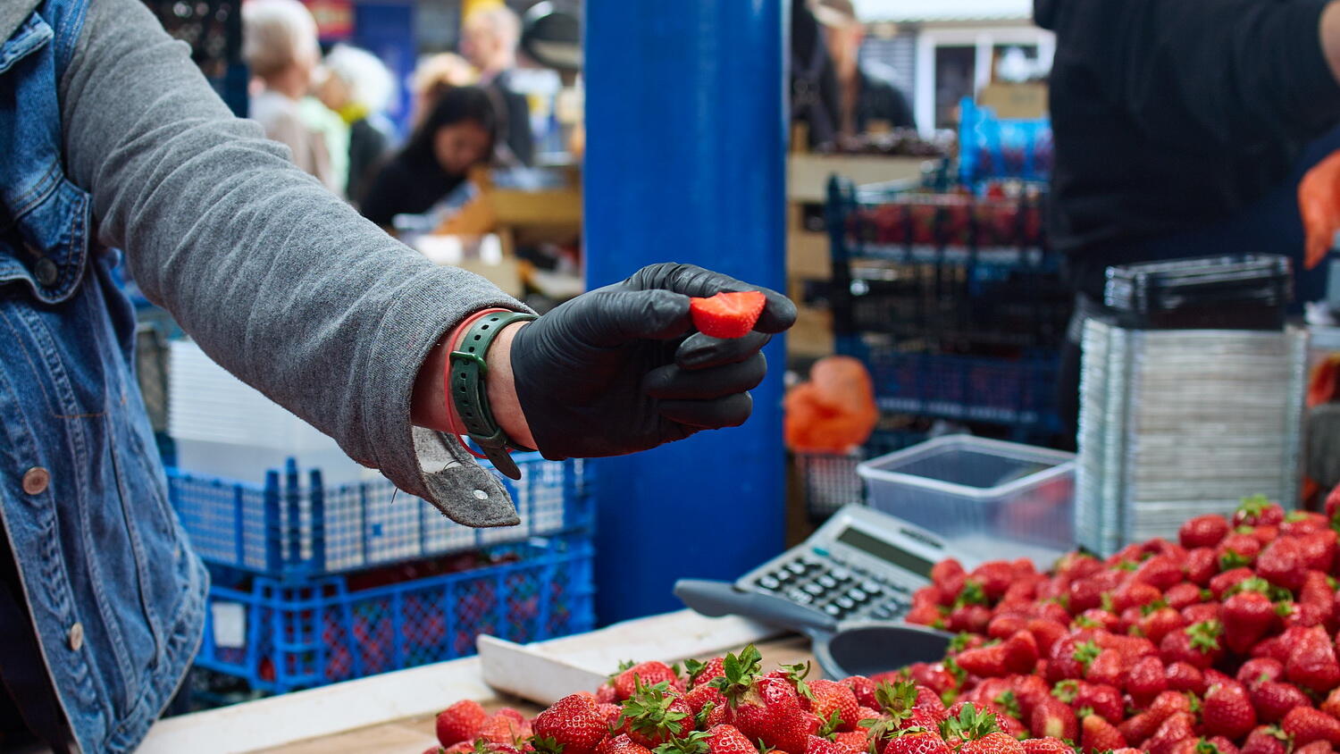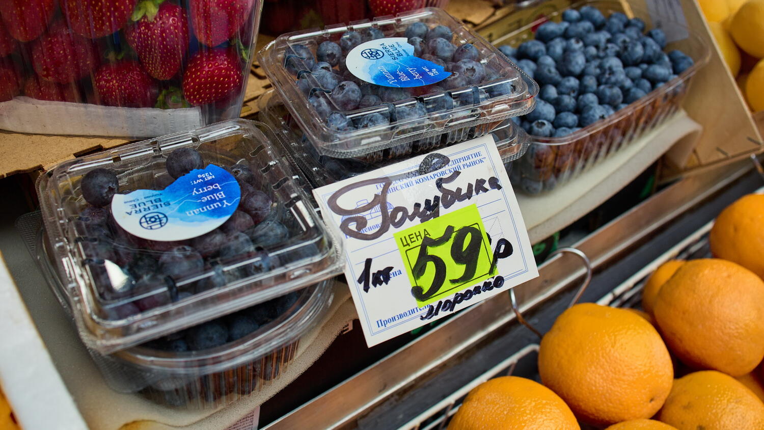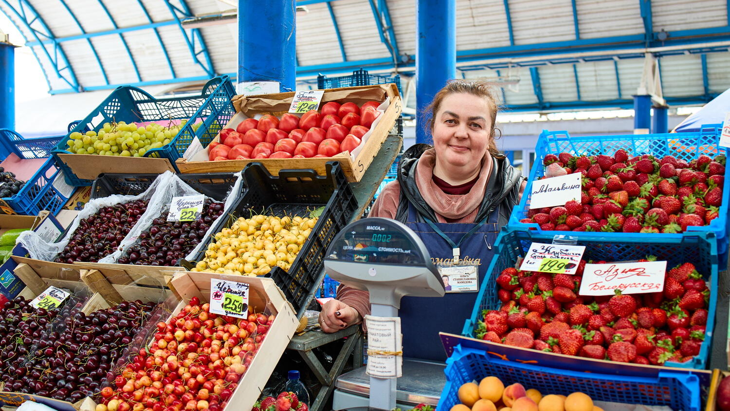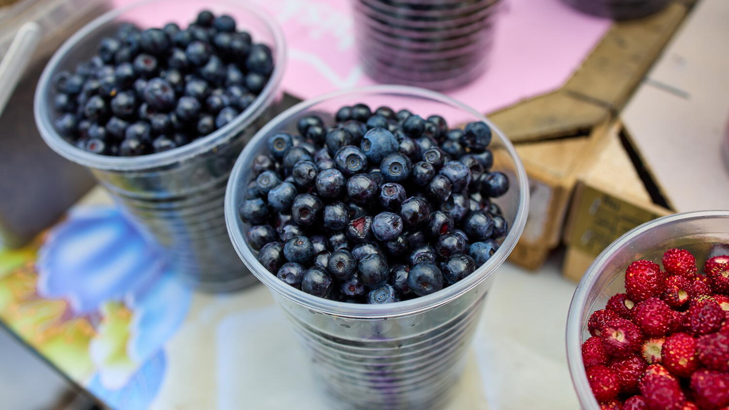 Будний день, полдень – но на рынке полно народа. Самые длинные очереди копятся у лотков с развесной ягодой: активнее всего разбирают клубнику с черешней. Кроме них, на прилавках уже лежит вишня, голубика, черника, смородина и даже земляника.