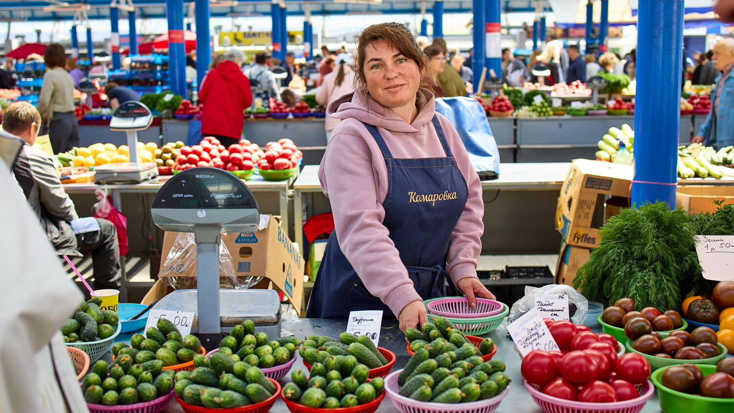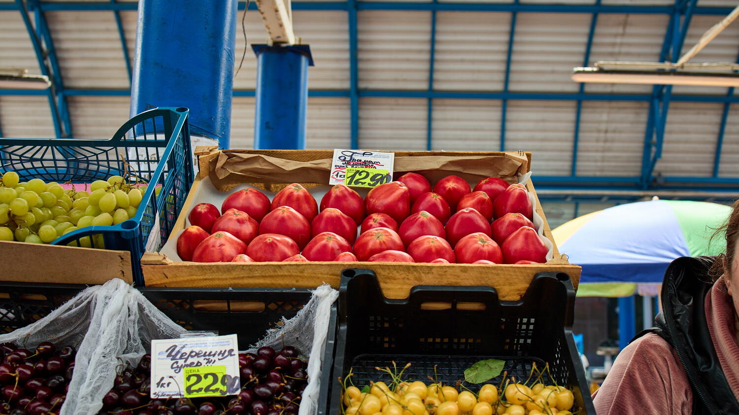Останавливаемся у лотков с привозным товаром: уже появились молодые узбекские абрикосы и томаты величиной с мужской кулак. Ими торгует Ольга – всего на Комаровке она работает больше 30 лет и успела повидать всякого. Жарко или холодно – ничего страшного, все переживали.