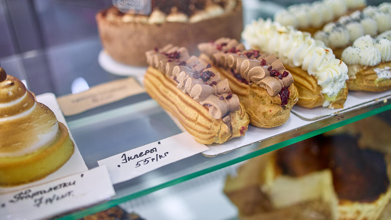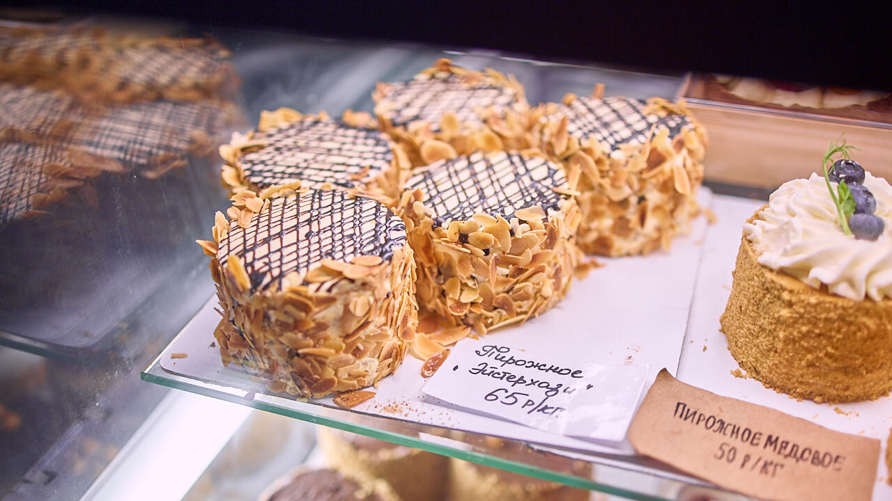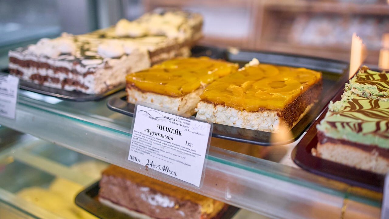 Находим пирожные по 50–65 BYN за кило: эклеры, шу, «Медовое», «Эстерхази», «Киевское», – а еще тарталетки по 7 рублей за штуку со щедрым слоем крема. И, конечно, торты с тем же ценовым разбросом – «Графские развалины», «Медовый», баскский чизкейк.