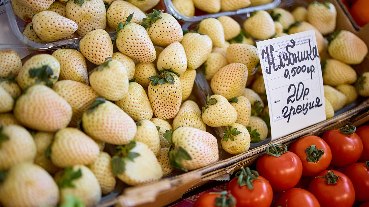 Заканчиваем рейд по фруктам и овощам необычной ананасовой клубникой белого цвета. Полкило стоит 20 BYN.