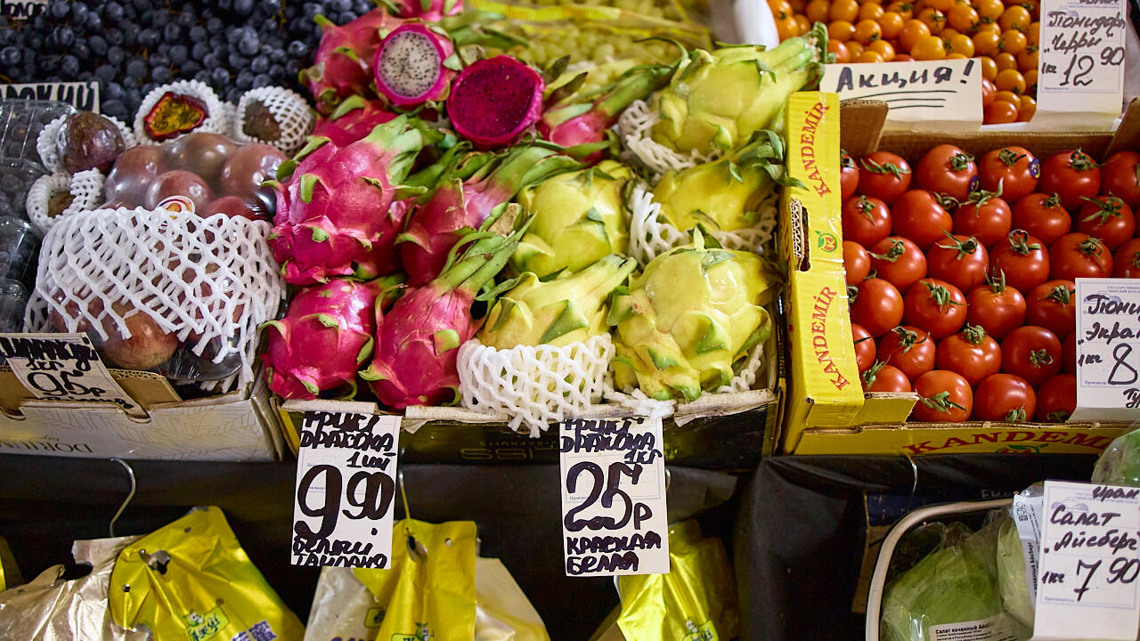Рядом находим фрукт дракона: 9,90 за штуку красного фрукта, 25 BYN – за кило желтого, – и голубику из Перу по рекордным ценам: 35 BYN за килограмм.