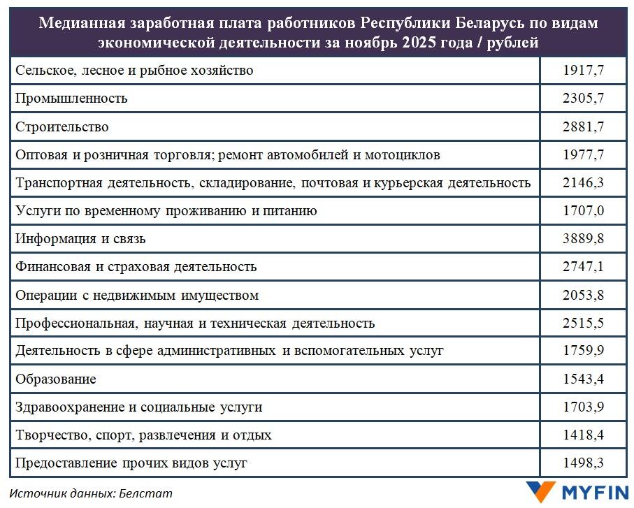 В сфере «Информация и связь» медианная зарплата за ноябрь 2025 года составляла 3889,8 рубля, в строительстве — 2881,7 рубля, в финансовой и страховой деятельности — 2747,1 рубля.