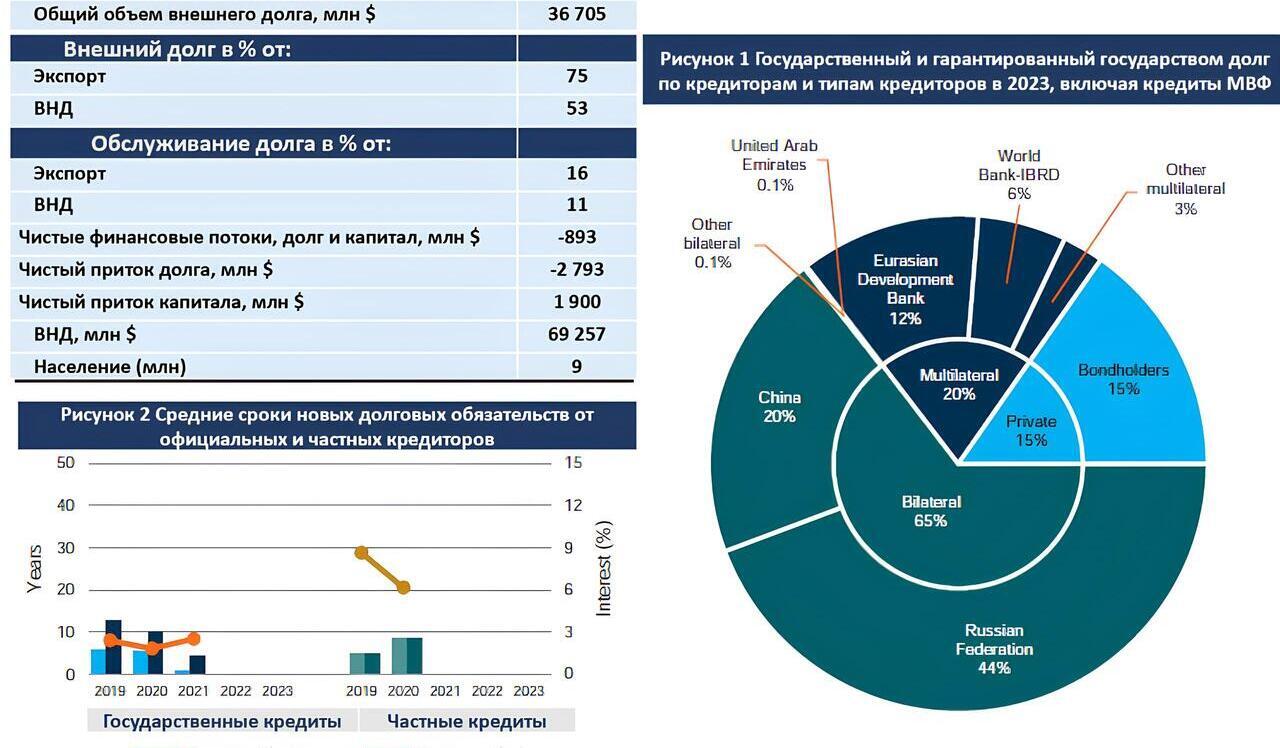 При этом долгосрочные государственные обязательства нашей страны, без учета гарантий правительства, в 2023 году уменьшились на 10,7 %, до $15,47 млрд. Самая большая задолженность – перед РФ – уменьшилась за год на 6 %, долг по облигациям – на 21,2 %, до $2,67 млрд; перед ЕАБР – на 6,3 %, до $1,87 млрд; перед Китаем – на 28,7 %, до $1,75 млрд.