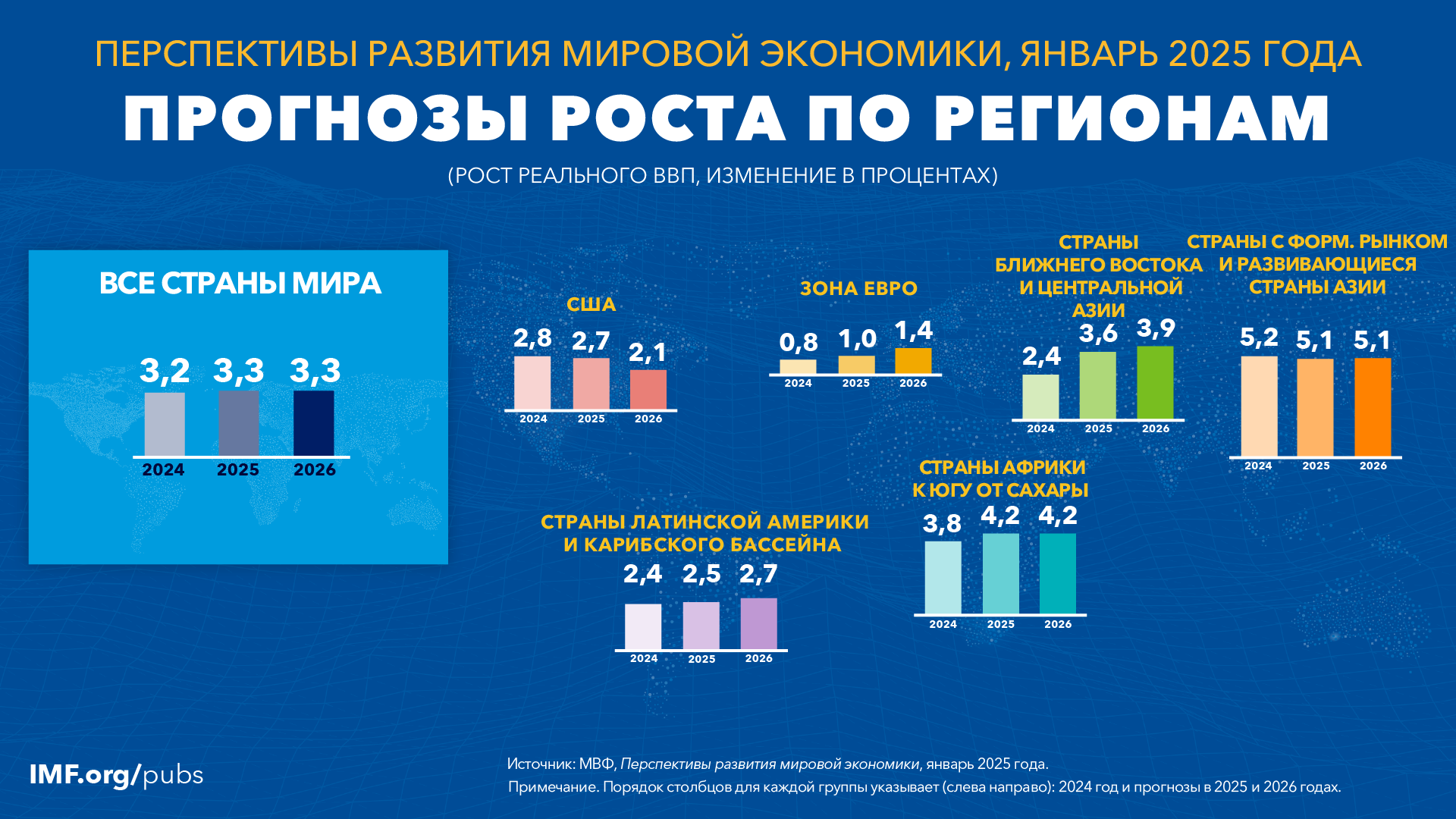 Прогнозируется снижение общей инфляции в мире до 4,2% в 2025 году и 3,5% в 2026 году.