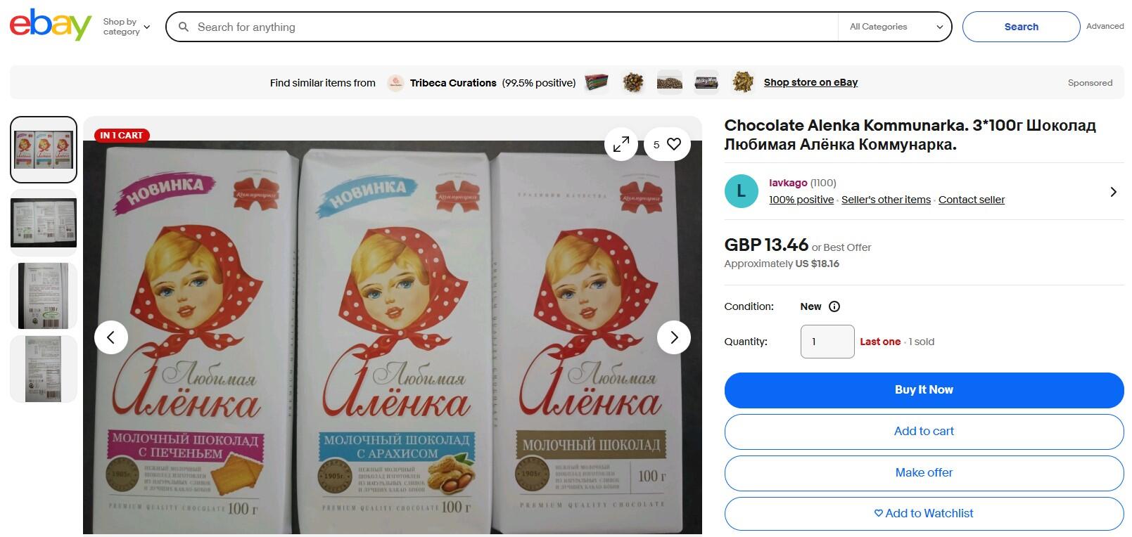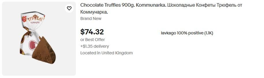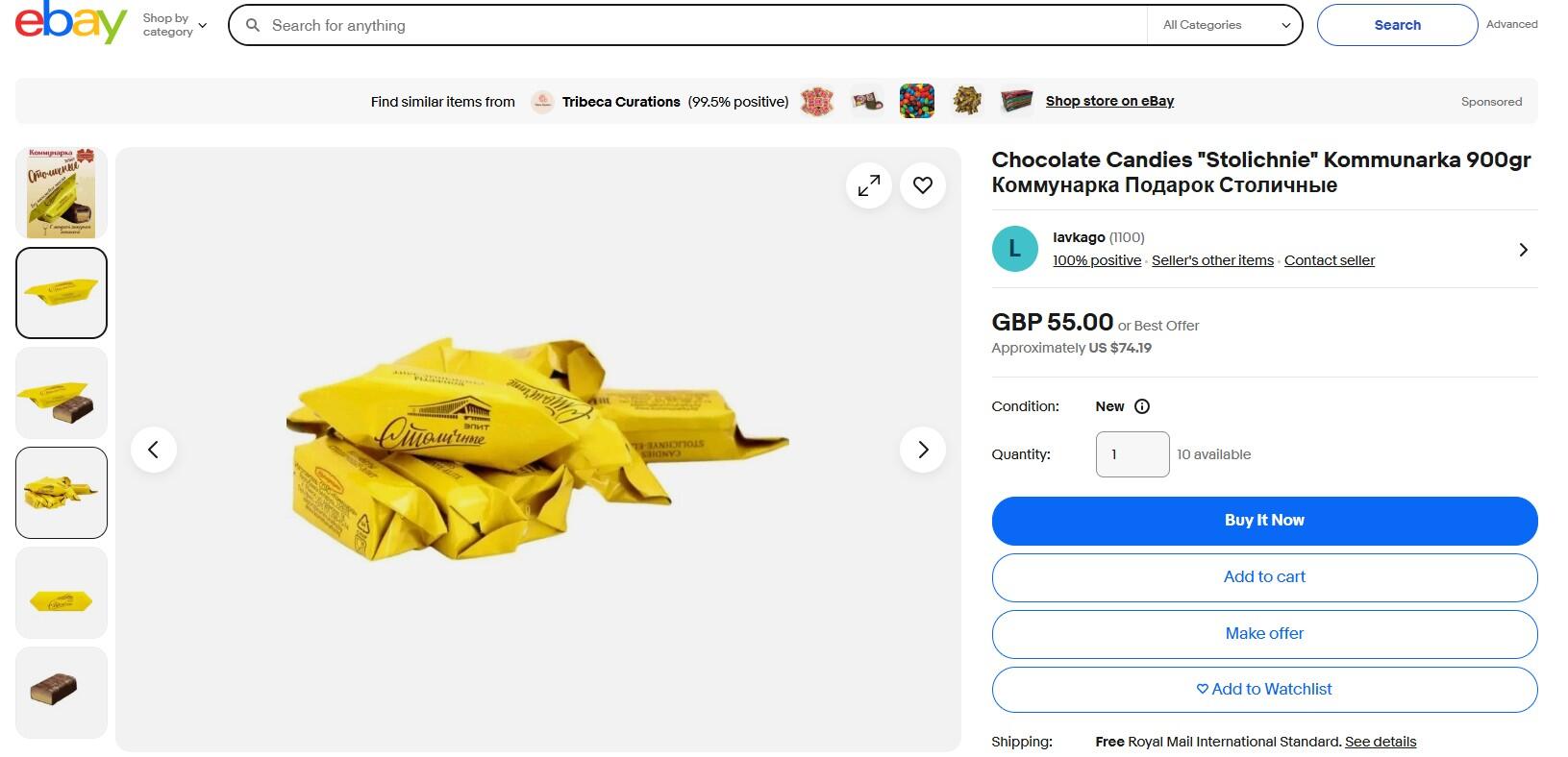 Также мы нашли на ebay белорусские конфеты «Птичье молоко» в упаковке по 850 грамм ($70,43/200 BYN), коммунарковский шоколад 200 грамм «С соленой карамелью» ($7,42/21 BYN), конфеты «Минчанка» в упаковке по 850 грамм ($57,46/164 BYN).
