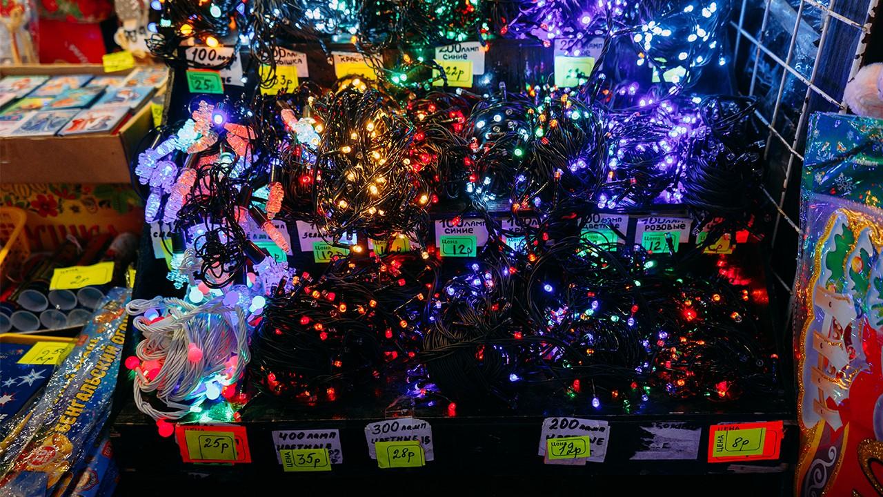 На елку от метра до двух лучше брать гирлянды на 200–400 лампочек. Такие на Комаровке продают за 18–45 рублей. Но это не предел. Самая большая гирлянда, которую удалось найти на рынке, – 50 метров за 50 рублей. Данная гирлянда по соотношению длина/стоимость, пожалуй, самая выгодная.