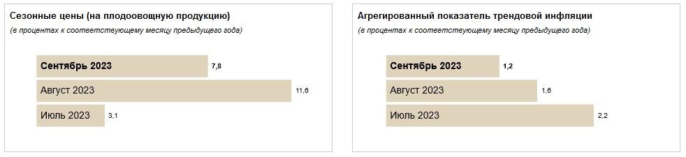 По сезонным ценам на плодоовощную продукцию показатель составил 7,8% к соответствующему месяцу 2022 года (11,6% было в августе и 3,1% – в июле).